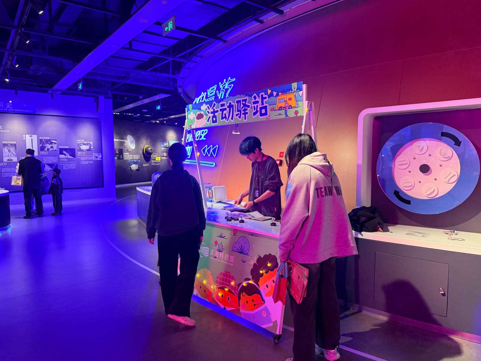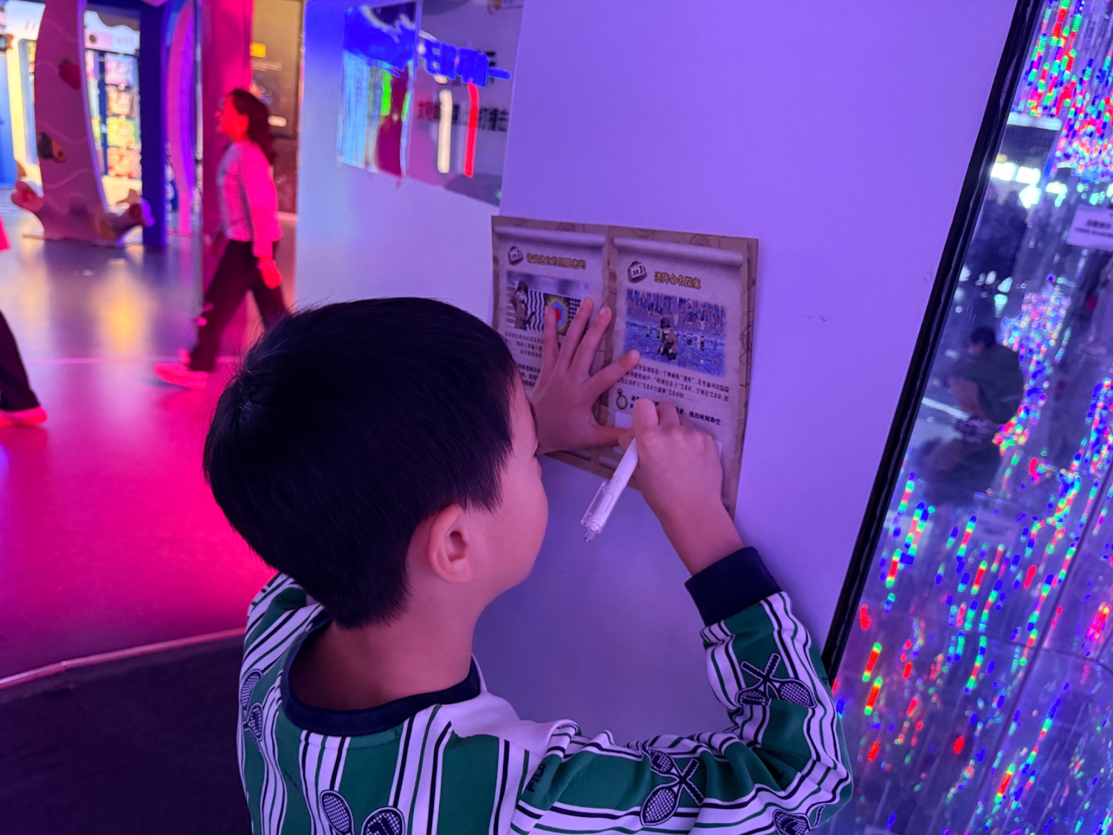 不同于传统科普形式,本次活动以侦探解谜故事为核心脉络,深度绑定滨海科技馆展区展项,打造“探索—体验—解谜—获线索”的完整互动链条。在活动中,参与的家庭在科技馆一层火箭区域集合,领取专属侦探手册,这既是探秘“地图”,也是科学闯关的“指南”。玩家需对照手册提示,在馆内精准找到对应展项,通过亲手操作展项、细致观察现象、沉浸式体验科学原理,自主发掘并解答展项关联的科学挑战题。每解开一道题,即可前往指定NPC处兑换侦探故事线索,解锁剧情新章节;通关的展项越多、掌握的科学知识越丰富,收集到的线索就越完整。最终,家庭成员需合力整合线索,破解核心侦探谜题,成功通关者将获得专属文创奖励,让科学探索的成就感与纪念意义双重叠加。“我认为这个活动过程非常有趣,可以锻炼脑力,同时还可以让我看到更多文化,其中我认识到这些建筑是哪个国家的,具体如何建成的。这个活动让我既能玩又能学习。”参与活动的学生兴奋地分享道。