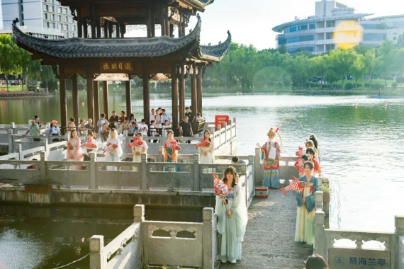 夜幕渐深,流光溢彩的灯光将校园装点得如江南夜色般浪漫?;疃谌隆熬盘炀肿嘣粕亍痹诤暇噬涎荩嗄晔ι砘泼废费菰?,身着精致戏服,粉墨登场。婉转悠扬的唱腔与细腻传神的表演,将黄梅戏的声腔韵味演绎得淋漓尽致。师生们聆听着这来自徽州大地的天籁之音。微风拂过湖面,泛起粼粼波光,与黄梅戏的雅韵交织在一起,营造出如诗如画的氛围。现场还开展了源自皖南泾县桃花潭的徽式龙舟竞渡活动,龙舟如离弦之箭般向前冲刺,岸边师生的呐喊助威声此起彼伏,将活动氛围再次推向高潮。